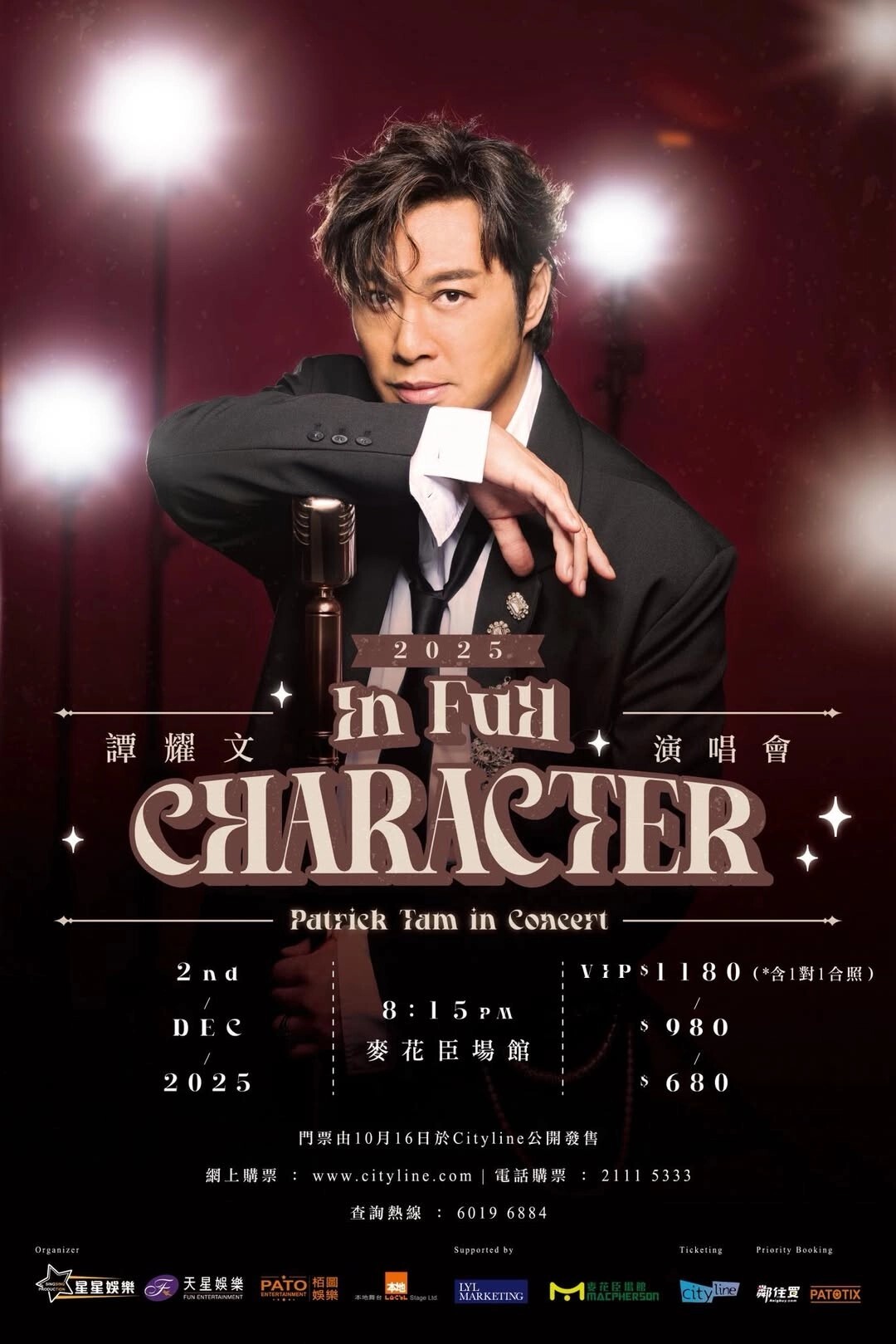 譚耀文 演唱會 2025, 演出日期: 2025年12月2日 (星期二), 門票價錢: HK$1180 / $980 / $680, 演出場館: 旺角麥花臣場館, 優先購票: 2025年10月13日12:00起 PATOTIX, 公開發售: 2025年10月16日12:00起 Cityline