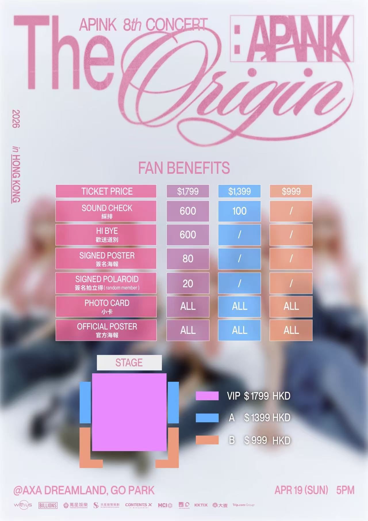 Apink 香港演唱會 2026, 演出日期: 2026年4月19日 (星期日), 門票價錢: HK$1799 / $1399 / $999, 演出場館: AXA 安盛創夢館 (西沙 GO PARK), 公開發售: 2026年3月17日11:00起 KKTIX